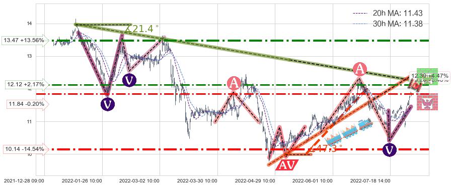 ♘ 阻力价格位12.12,可信任强度69.36%,距离最后交易2022-08-12 14:00形成的收盘价格11.86相差 +2.17%