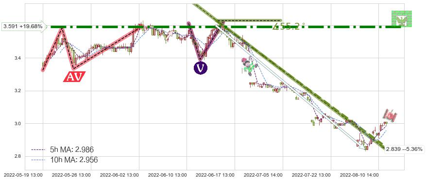 ♘ 阻力价格位3.591,可信任强度97.74%,距离最后交易2022-08-12 14:00形成的收盘价格3.000相差 +19.68%