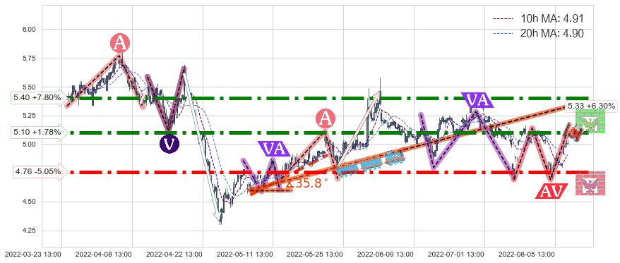 ♘ 阻力价格位5.10,可信任强度86.06%,距离最后交易2022-08-12 14:00形成的收盘价格5.01相差 +1.78%