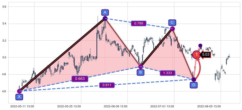 ➣ 谐波伽利:c下跌到达d:猜想拉升 → 上涨 →【拐点】强支撑临近 → 大趋势均值回复