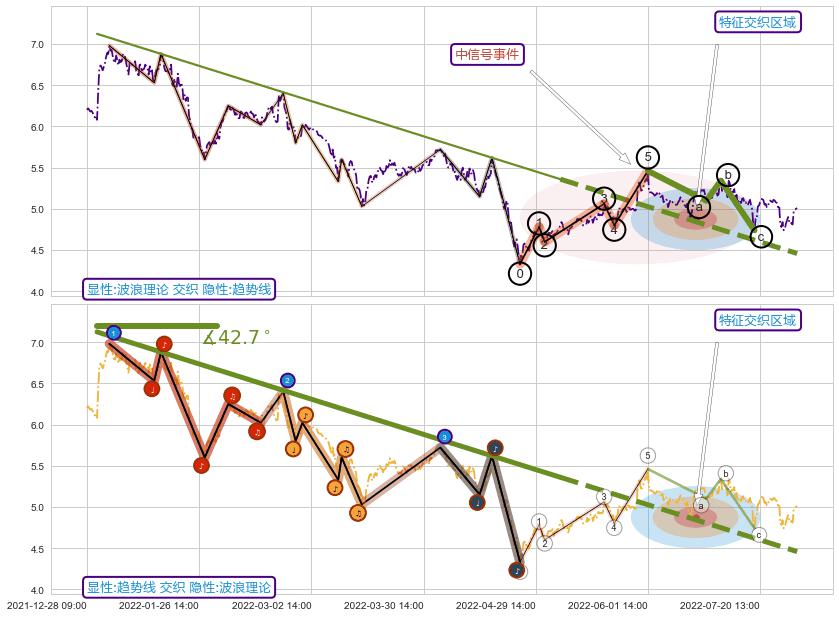 ➢ 2021-12-29 14:00-2022-05-11 10:00下跌趋势存在反转上涨[机会],其原下跌趋势的阻力位(4.46)已被突破[强支撑信号],原下跌趋势角度: 42.7˚