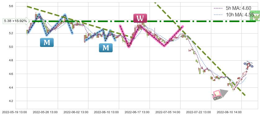 2022-06-16: 第一阻力位5.38强力阻拦了上升趋势,成功阻止了价格的继续上涨。