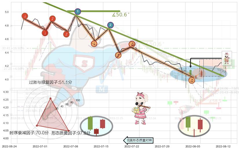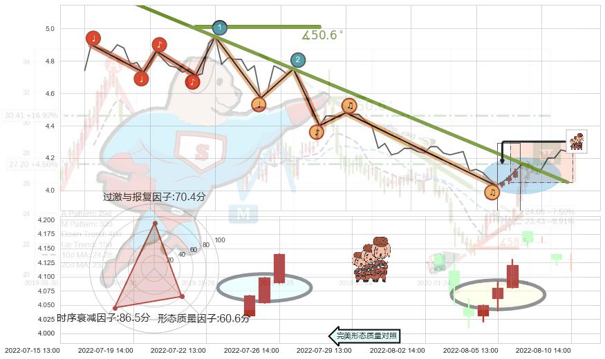 ➢ 2022-06-22 13:00-2022-08-11 14:00下跌趋势存在反转上涨[机会],其原下跌趋势的阻力位(4.05)已被突破[强支撑信号],原下跌趋势角度: 50.6˚