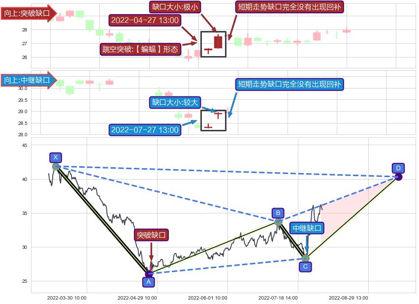 ➢ 跳空突破【蝙蝠】形态关键点后,后续非关键走势也无缺口回补迹象,突破缺口可信度提高