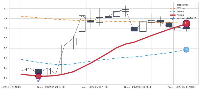 📝 多条均线形成死叉后走势最低价格达到: 5.62