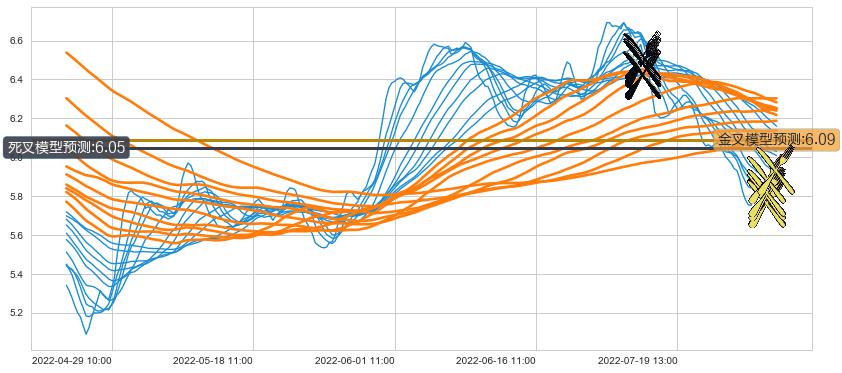 ➣ 55小时均线于(07-08 14:00: 6.42)形成【死叉】基于【死叉历史模型】预测死叉后最低波谷价格: 5.94, 死叉后最低价格5.62,已经下跌超出预测最低波谷价格, 预期反弹
