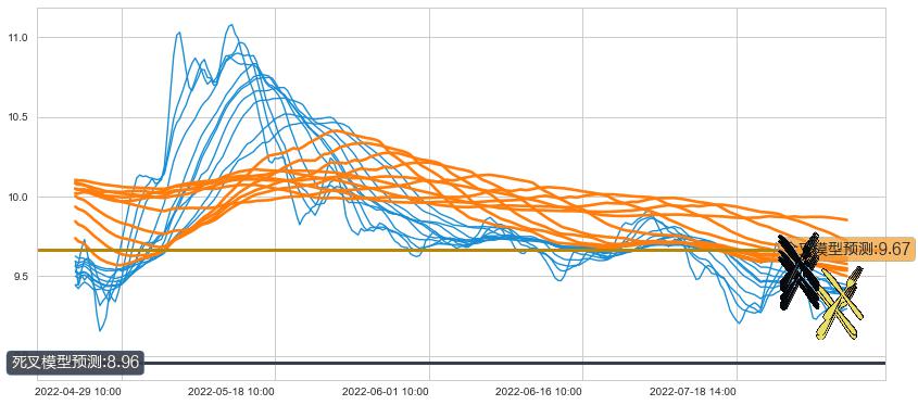➢ 55小时均线于(08-01 14:00: 9.57)形成【死叉】基于【死叉历史模型】预测死叉后最低波谷价格: 8.96, 死叉后最低价格9.19,尚未达到预测最低波谷价格, 预期继续下跌