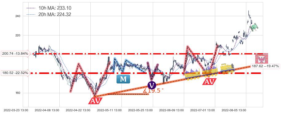 从2022-04-25 14:00至2022-08-12 14:00,共包含254个小时,阶段股价上涨42.37%,阶段股价变动位移路程比: 1 : 7,上涨趋势角度: 19.5