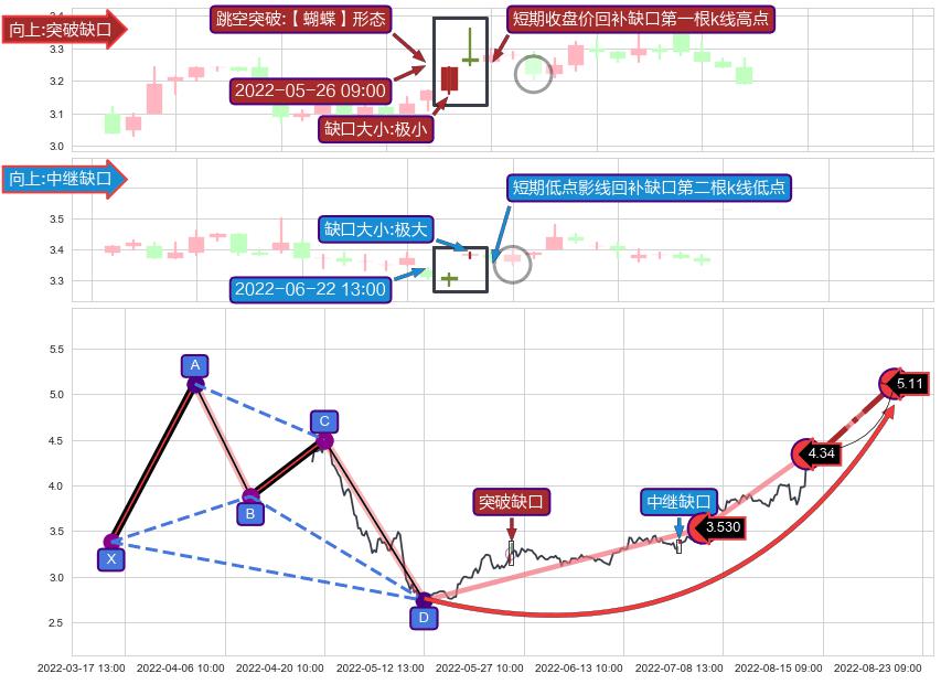 ➣ 突破缺口形成后,后续k已经超过14根,跳空突破【蝴蝶】形态关键点后, 出现【完全回踩】迹象,短期收盘价回补缺口第一根k线高点