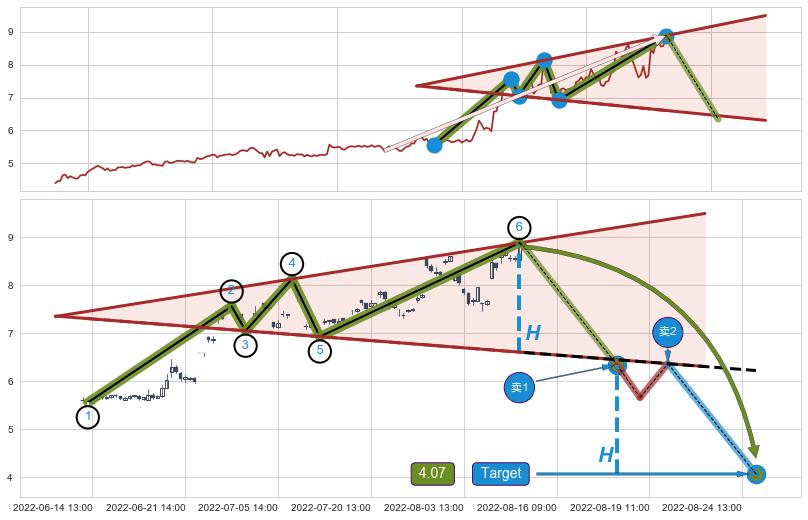 ➣ 扩散三角反转:猜想临近关键支撑位突破点 → 临近拐点下跌 → 风险信号 → 大趋势均值回复