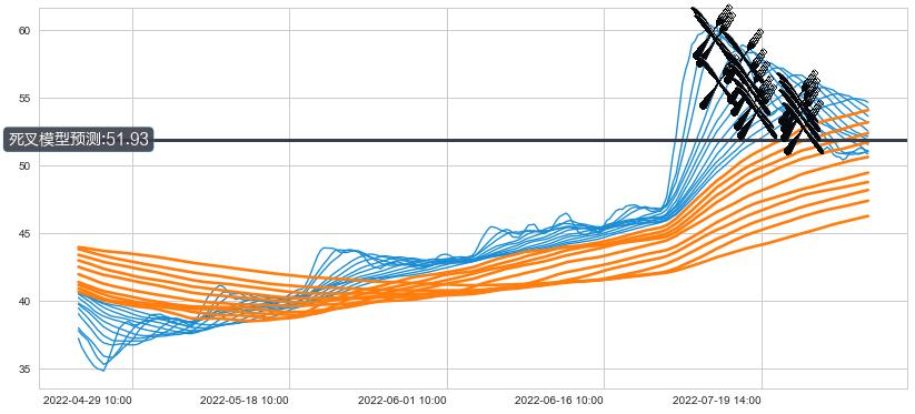 ➣ 60小时均线于(07-27 14:00: 53.73)形成【死叉】基于【死叉历史模型】预测死叉后最低波谷价格: 50.04, 死叉后最低价格49.95,虽然已经到达预测最低波谷价格,但耗时间很短动能很强, 预期继续下跌