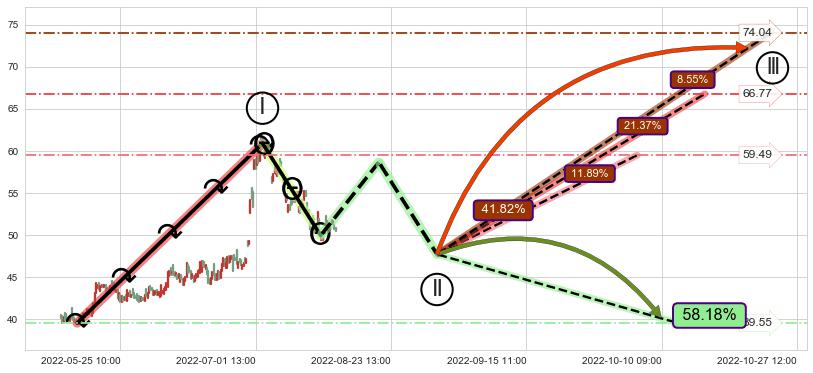 ➣ 高概率大级别循环上涨浪被破坏,反转向下(突破5浪起点)概率58.18%