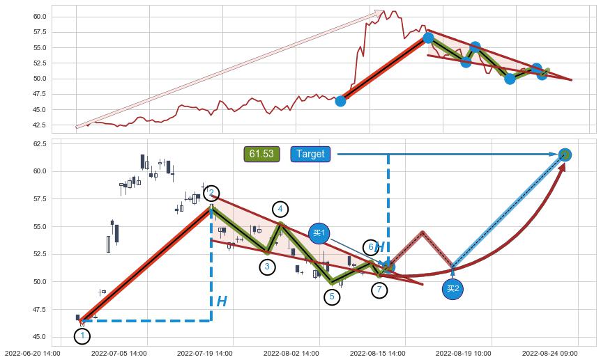 ➣ 收盘价(07-12:14: 57.60 )→回踩→第二根k线高点(07-11:13: 56.95 )