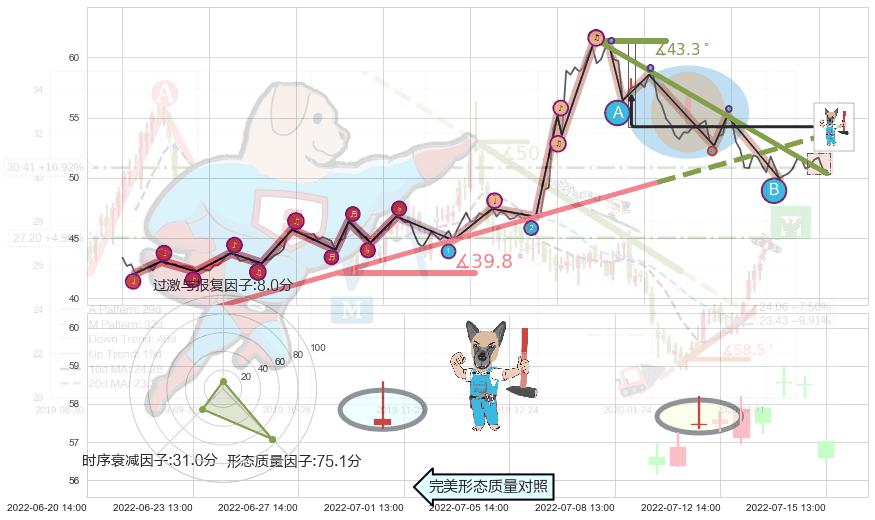 ➢ 2022-05-25 10:00-2022-07-15 13:00上升趋势存在反转[风险],其原上升趋势的支撑位(53.61)已破位[强阻力信号],原上升趋势角度: 39.8˚