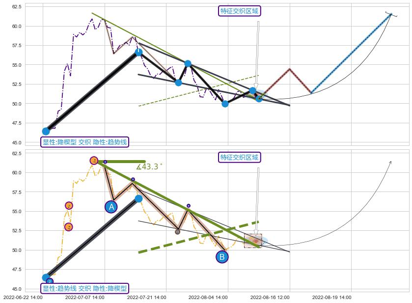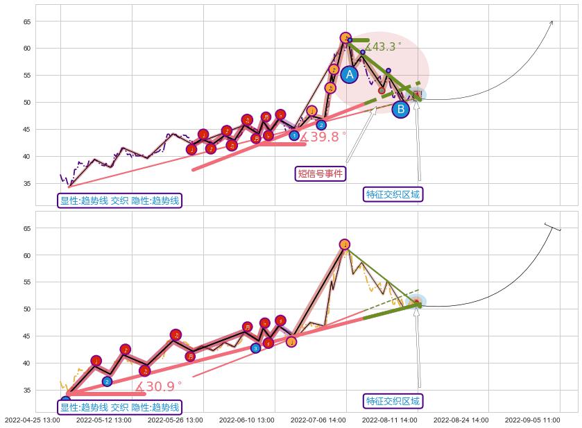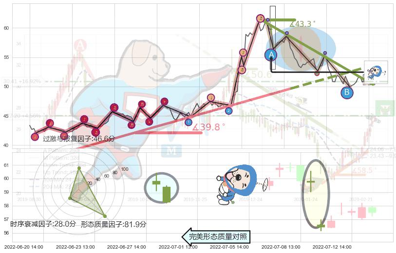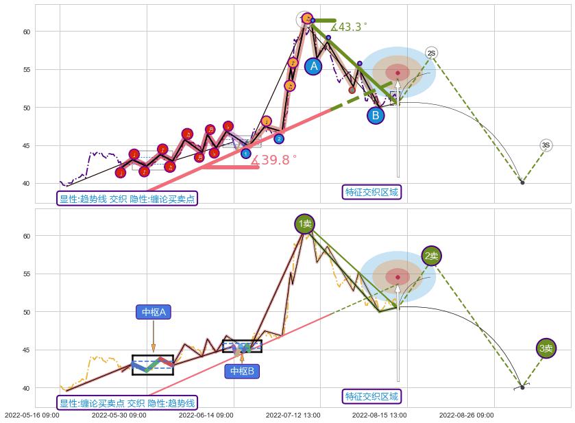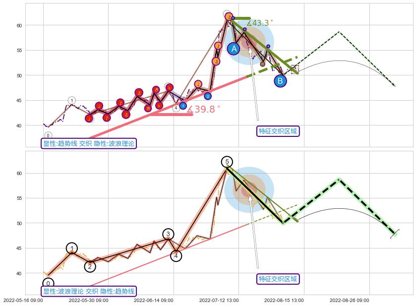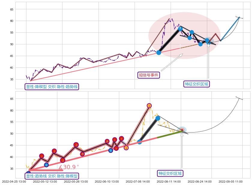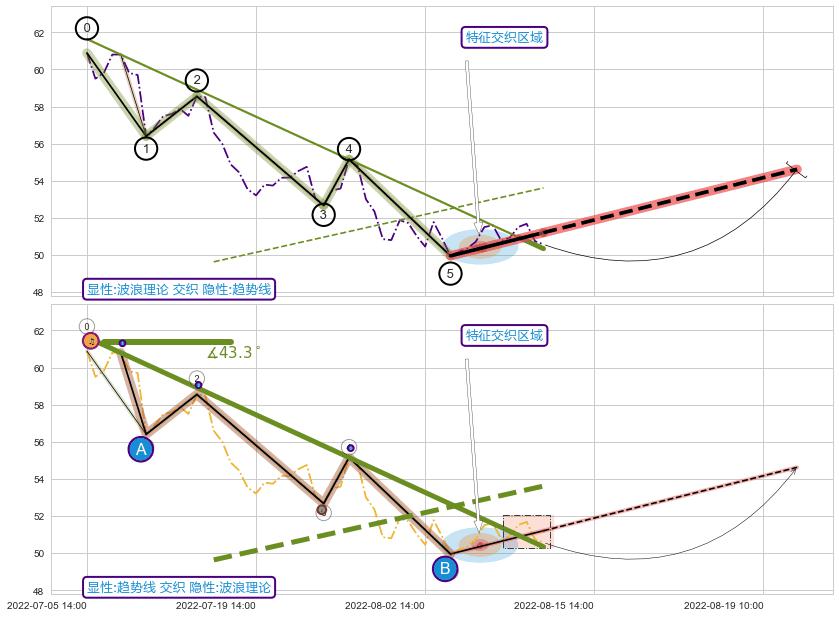 从2022-07-05 14:00至2022-08-11 13:00,共包含52个小时,阶段股价下跌-16.04%,阶段股价变动位移路程比: 1 : 3,下跌趋势角度: 43.3