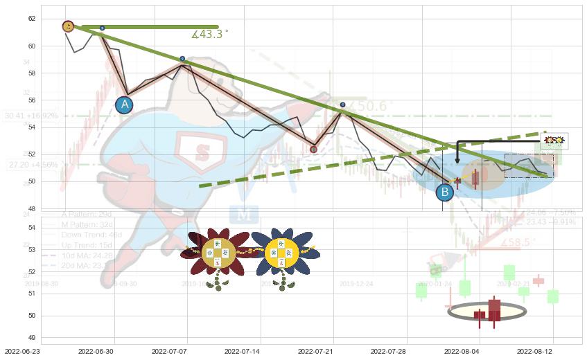 ➢ 2022-07-05 14:00-2022-08-11 13:00下跌趋势存在反转上涨[机会],虽然原下跌趋势的阻力位(50.34)已被突破,但其阻力效果尚存,原下跌趋势角度: 43.3˚