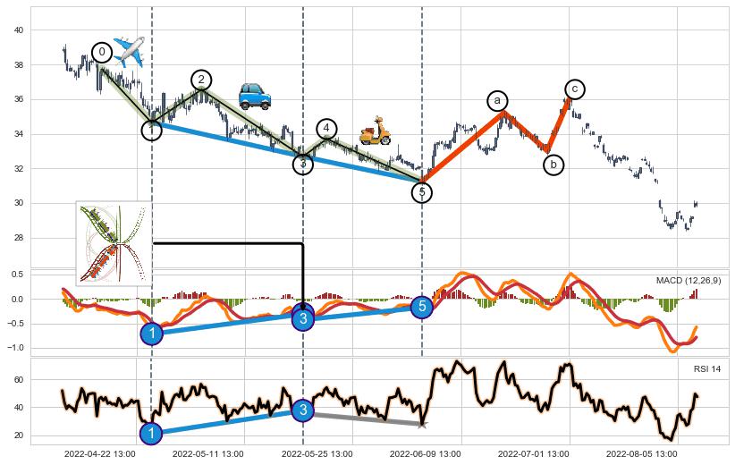 ➣ 第一, 三, 五浪下跌动能逐渐【衰弱变小】,趋势呈现不稳迹象