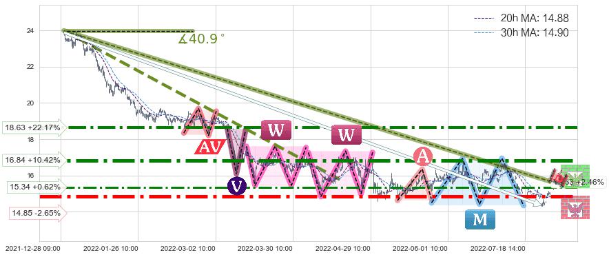 🦴 长线均值回复组合短线趋势跟踪[强阻力信号]2021-12-28 14:00-2022-08-11 13:00下跌趋势依然成立(下跌趋势跟踪依然存在),短线价格略微上行反弹(均值回复猜想),即将接近下跌趋势提供的未破位阻力价格:15.63。