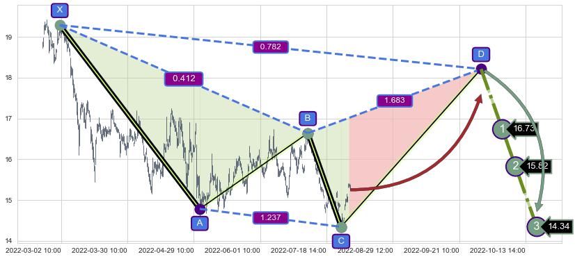➢ 谐波赛福:b持续蓄力下跌击穿越过c:猜想报复性拉升 → 上涨 →【拐点】强支撑临近 → 大趋势均值回复