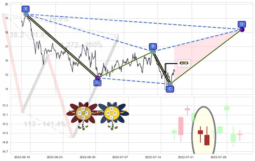 ➣ D点拟合预测价格18.21,距离最后交易收盘价格15.25相差 +19.42%