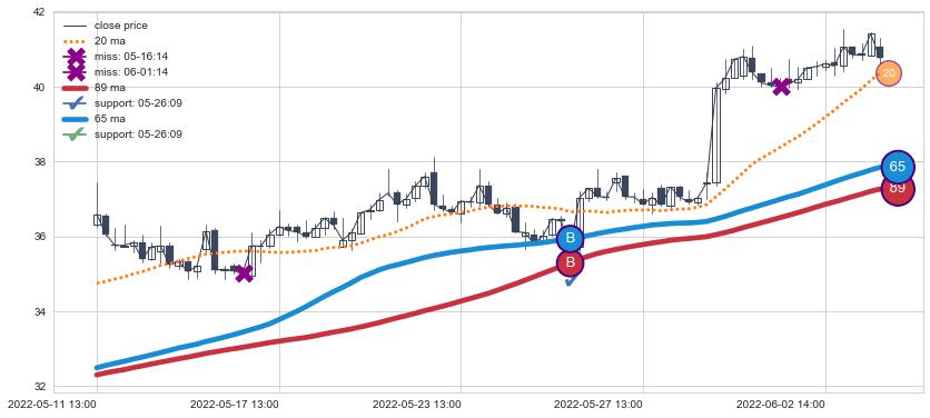 ➣ 65小时均线于(08-10 14:00: 32.33)形成【金叉】基于【金叉历史模型】预测金叉后最高波峰价格: 34.90, 金叉后最高价格35.85,已经上涨超出预测最高波峰价格, 预期回调