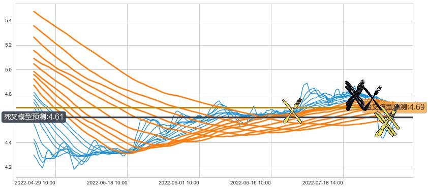 ➣ 60小时均线于(07-22 14:00: 4.76)形成【死叉】基于【死叉历史模型】预测死叉后最低波谷价格: 4.59, 死叉后最低价格4.37,已经下跌超出预测最低波谷价格, 预期反弹