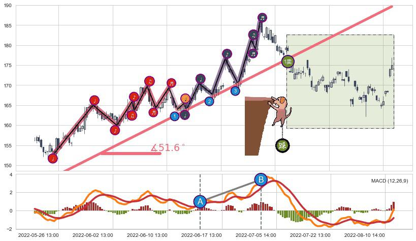 从2022-06-14 11:00至2022-07-07 13:00,共包含45个小时,阶段股价上涨8.73%,阶段股价变动位移路程比: 1 : 4,上涨趋势角度: 45.7