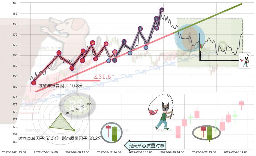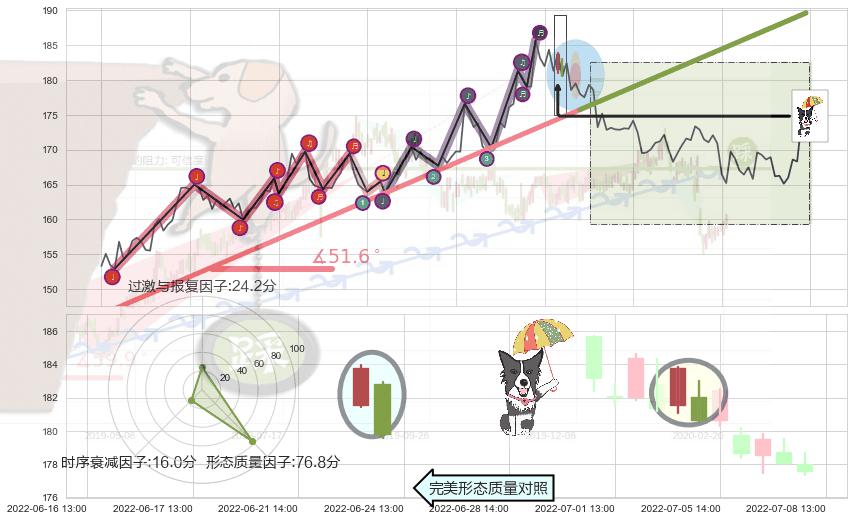 ➢ 2022-05-26 10:00-2022-07-07 13:00上升趋势存在反转[风险],其原上升趋势的支撑位(189.65)已破位[强阻力信号],原上升趋势角度: 51.6˚