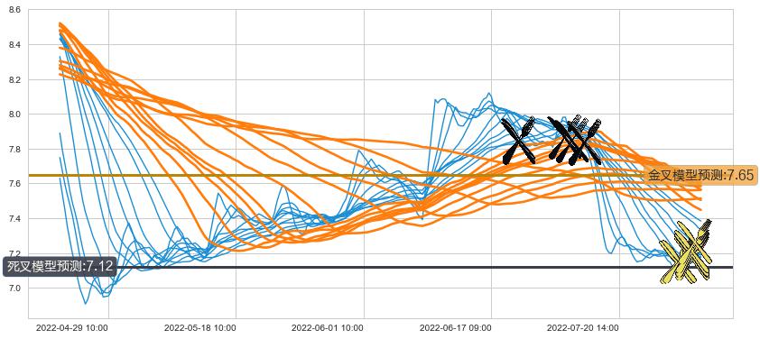 ➢ 55小时均线于(06-22 14:00: 7.85)形成【死叉】基于【死叉历史模型】预测死叉后最低波谷价格: 7.28, 死叉后最低价格7.02,已经下跌超出预测最低波谷价格, 预期反弹