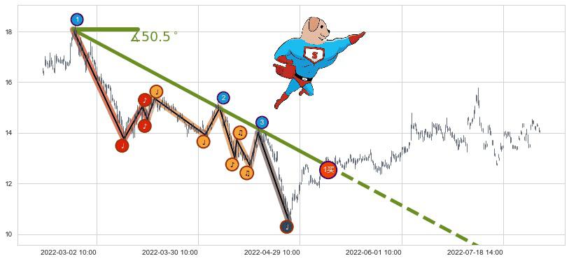 从2022-02-23 13:00至2022-05-11 10:00,共包含249个小时,阶段股价下跌-30.20%,阶段股价变动位移路程比: 1 : 8,下跌趋势角度: 50.5