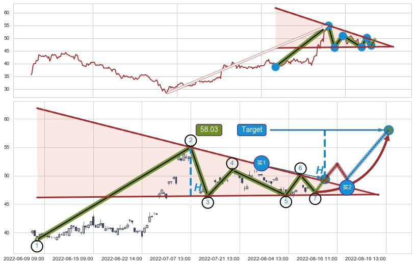 ➢ 最小中继整理涨幅→𝐇: 8.60 (高点逐步降低斜边第一阻力点②与支撑边垂直距离)