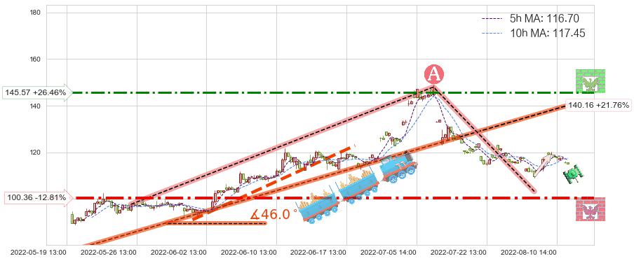 ♘ 阻力价格位145.57,可信任强度58.02%,距离最后交易2022-08-12 14:00形成的收盘价格115.11相差 +26.46%