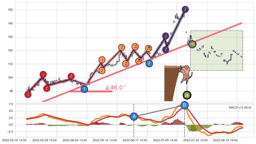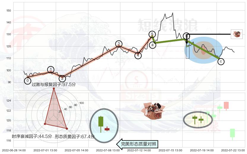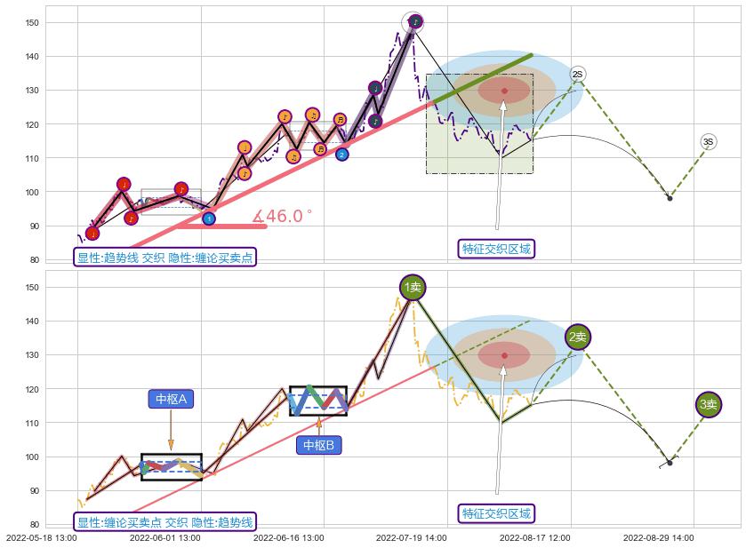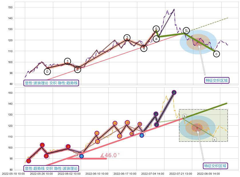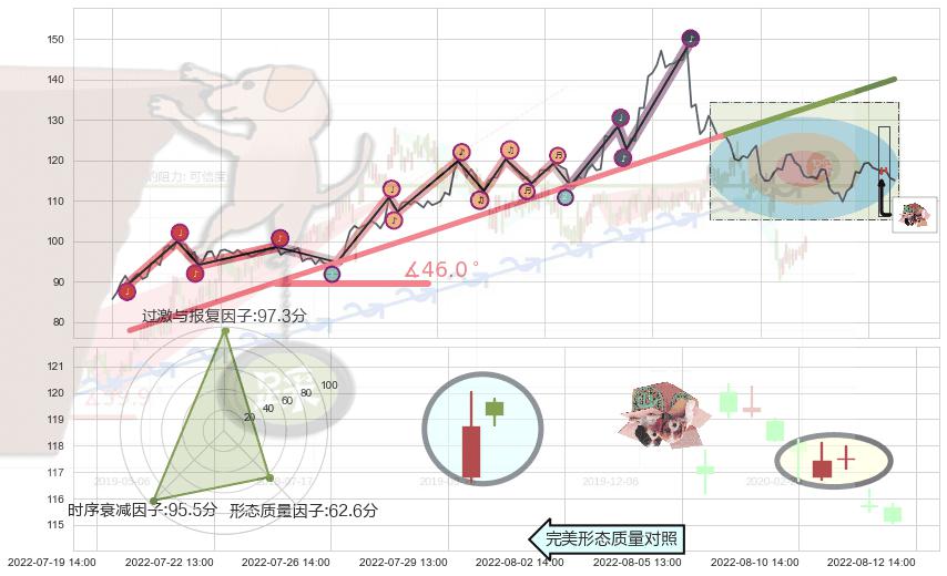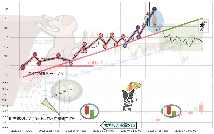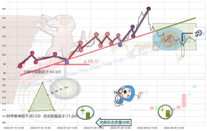 从2022-05-20 09:00至2022-07-15 13:00,共包含139个小时,阶段股价上涨36.98%,阶段股价变动位移路程比: 1 : 5,上涨趋势角度: 46.0