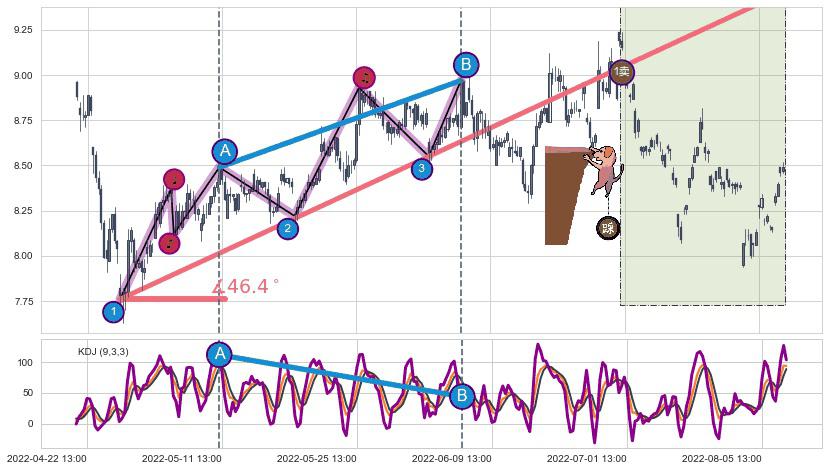 从2022-04-27 09:00至2022-06-14 10:00,共包含152个小时,阶段股价上涨8.12%,阶段股价变动位移路程比: 1 : 12,上涨趋势角度: 46.4