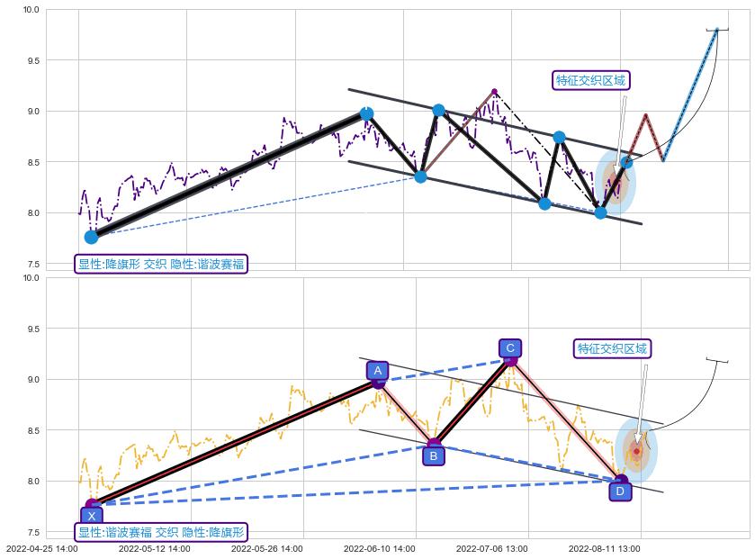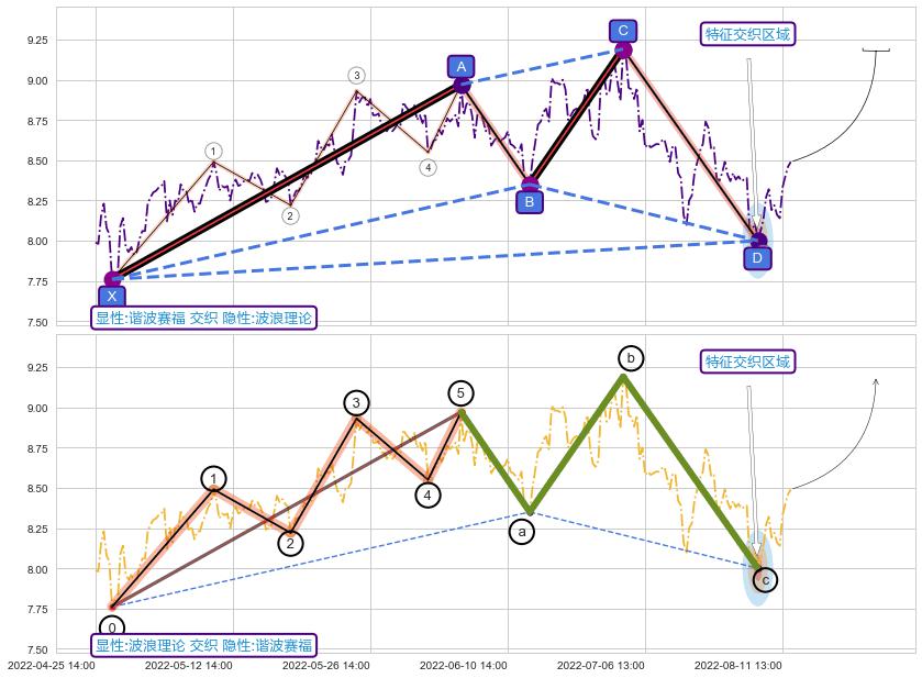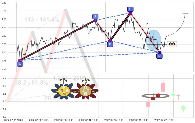 ➣ 谐波赛福:c下跌到达d:猜想拉升 → 上涨 →【拐点】强支撑临近 → 大趋势均值回复