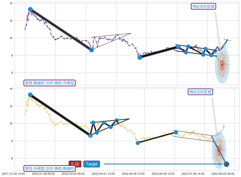 ➣ 下降对称三角整理:猜想临近关键支撑位突破点 → 临近拐点下跌 → 风险信号 → 大趋势均值回复