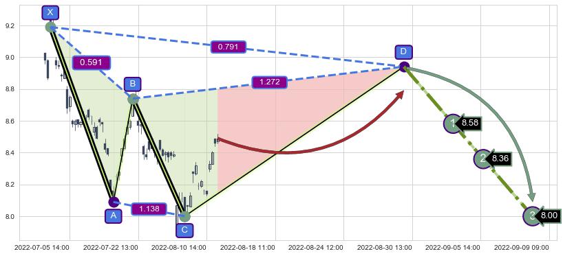 ➣ 未完成【赛福】形态起点X: 06-30:13, 已到达C点: 08-03:14, 预测最终D点: 08-30:10, 共130交易小时