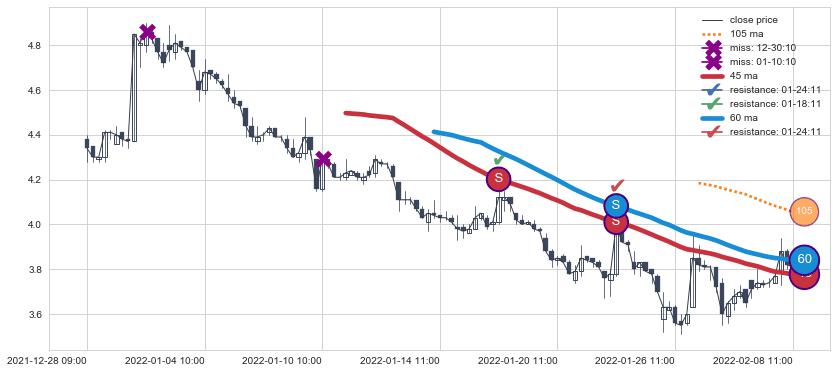 ➣ 40小时均线于(07-14 14:00: 4.00)形成【死叉】基于【死叉历史模型】预测死叉后最低波谷价格: 3.759, 死叉后最低价格3.540,已经下跌超出预测最低波谷价格, 预期反弹