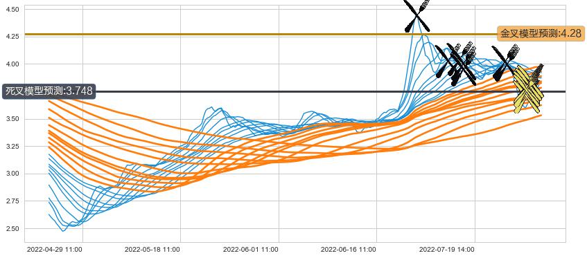 ➣ 30小时均线于(07-08 14:00: 4.02)形成【死叉】基于【死叉历史模型】预测死叉后最低波谷价格: 3.853, 死叉后最低价格3.540,已经下跌超出预测最低波谷价格, 预期反弹