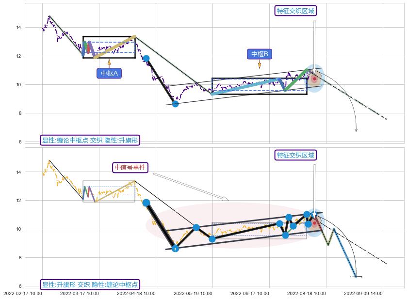 ➣ 缠论中枢点:猜想破位中枢B后持续下拉 → 下跌 → 破位中枢B支撑 → 持续趋势跟踪