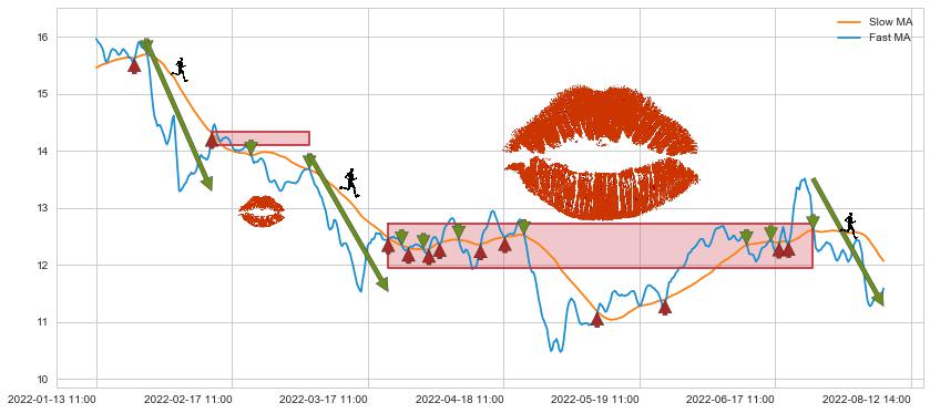 01-24 14:00至02-14 11:00 慢线与快线呈空头排列, 慢线与快线接触少,无缠绕