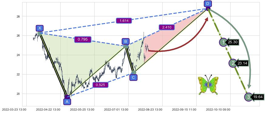 ➢ 谐波蝴蝶:b下跌接近c:猜想支撑性拉升 → 上涨 →【拐点】支撑临近 → 大趋势均值回复