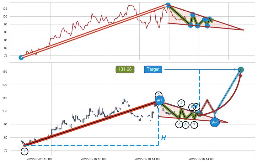 ➢ 最小中继整理涨幅→𝐇: 33.60 (𝐇楔型旗杆的长度:楔型起点→顶点)