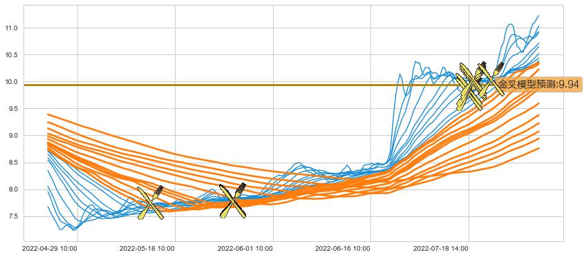 ➣ 40小时均线于(07-26 13:00: 10.03)形成【金叉】基于【金叉历史模型】预测金叉后最高波峰价格: 10.54, 金叉后最高价格11.45,已经上涨超出预测最高波峰价格, 预期回调