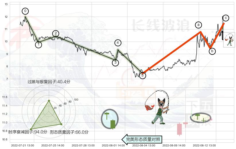 从2022-06-28 13:00至2022-08-12 14:00,共包含66个小时,阶段股价上涨7.76%,阶段股价变动位移路程比: 1 : 13