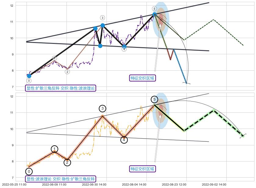 ➢ 波浪理论上涨浪:浪5回调拐点 🔜 扩散三角反转临近支撑猜想转换阻力下跌 综合量化分数:43.41 【偏空】