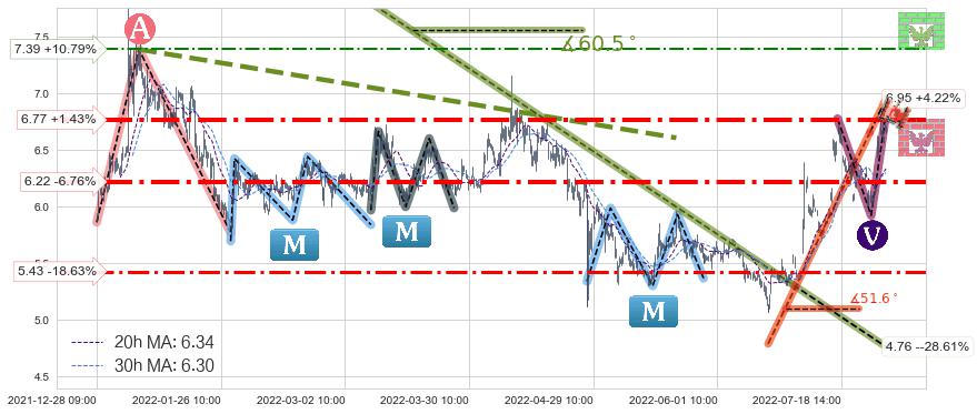 ♘ 阻力价格位7.39,可信任强度53.48%,距离最后交易2022-08-12 14:00形成的收盘价格6.67相差 +10.79%