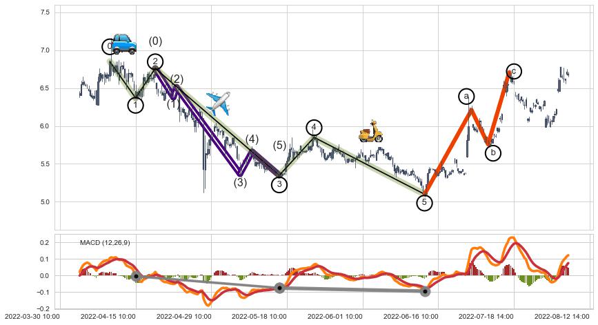 ➢ 波浪理论:猜想击穿突破c点后继续上涨 → 上涨 → 机会信号 → 小趋势跟踪