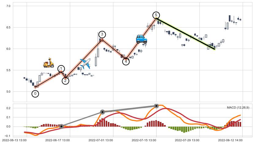 从2022-06-14 11:00至2022-07-15 14:00,共包含58个小时,阶段股价上涨26.51%,阶段股价变动位移路程比: 1 : 2,上涨趋势角度: 52.9,2022-07-13 13:00向⇪形成缺口,跳空上涨+6.17%