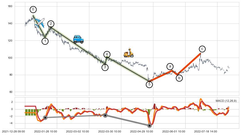 ➢ 波浪理论:猜想达到c点后小反弹终止反转下跌 → 下跌 → 【拐点】临近 → 阶段均值回复结束后继续大周期趋势跟踪
